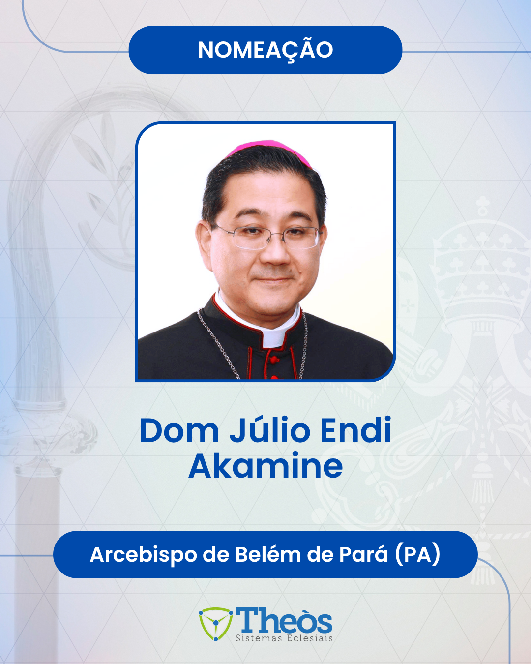 Em nome da Theòs Sistemas Eclesiais, queremos expressar as nossas mais sinceras felicitações a dom Júlio Endi Akamine por sua nomeação como novo arcebispo da Arquidiocese de Belém do Pará.